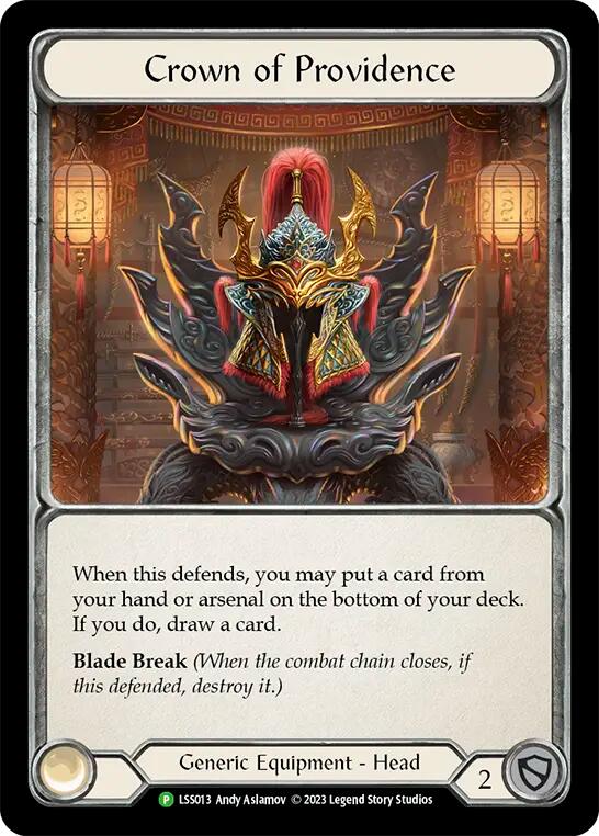 Legendary (You may only have 1 Fabric of Providence in your deck.) Equip Crown of Providence. If you don't, negate this. When this defends, you may put a card from your hand or arsenal on the bottom of your deck. If you do, draw a card. Blade Break (When the combat chain closes, if this defended, destroy it.)